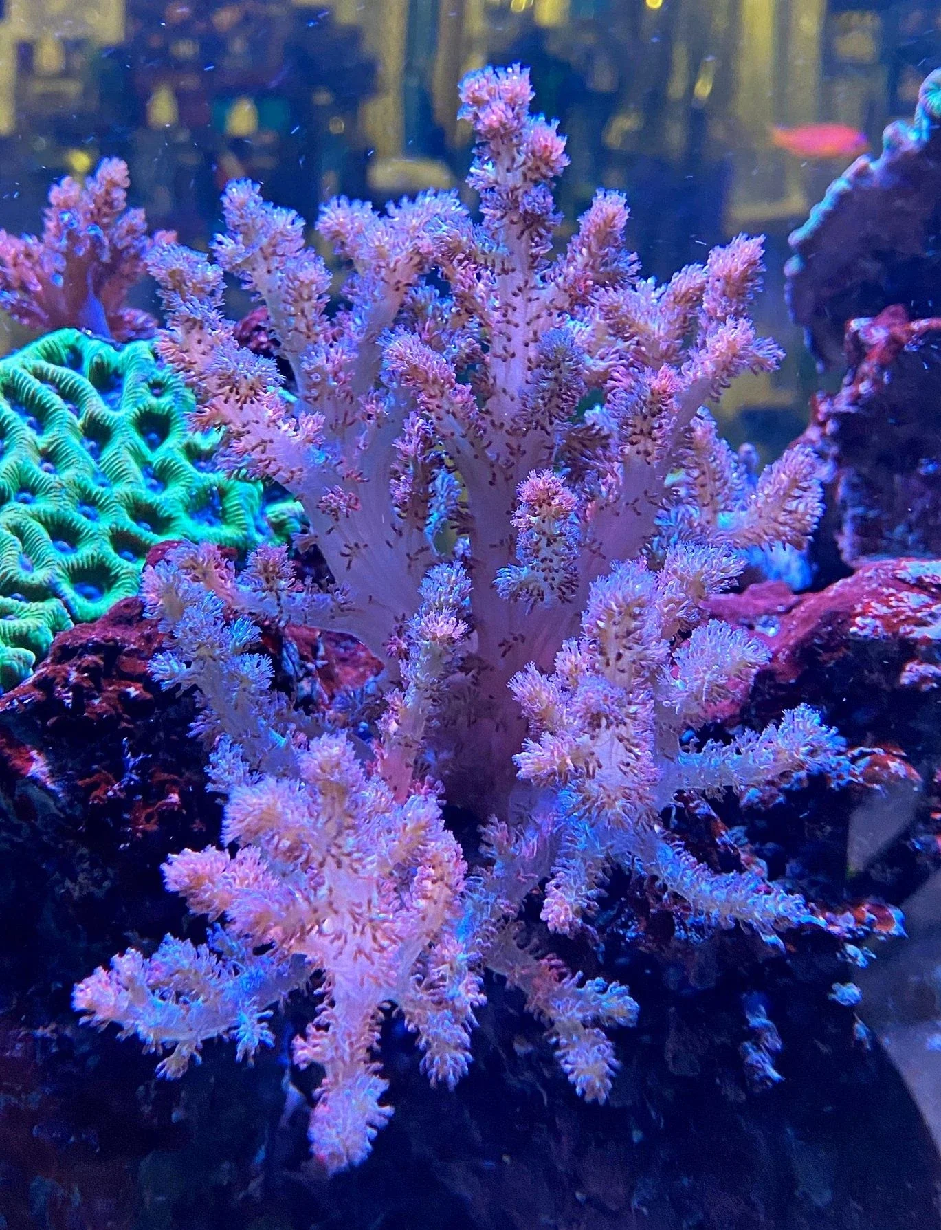 Sie nimmt trotz ihrer Symbiose mit Zooxanthellen gerne eine Zusatzfütterung aus kleinerem Zooplankton (Cyclop Eeze, Frostbosmiden, Frostcyclops, Artemia-Nauplien) an. Hat einen leicht violetten, teilweise gelblichen Farbunterton und ist in jedem Aquarium ein Hingucker. Die Wachstumsrate ist deutlich langsamer als z.B. bei Lithophyton oder Capnella, wächst aber konstant und bildet schöne, buschartige Kolonien. Zusammengezogen zeigen sich die stacheligen Sclerite, die für diese Gattung typisch ist.