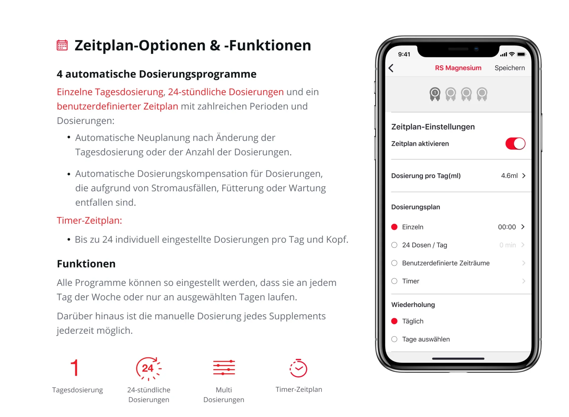 4 einfach einzustellende / zu aktualisierende, intelligente Dosierungsoptionen für jeden Kopf, die automatisch zu einem koordinierten Zeitplan für das gesamte Gerät kombiniert werden.