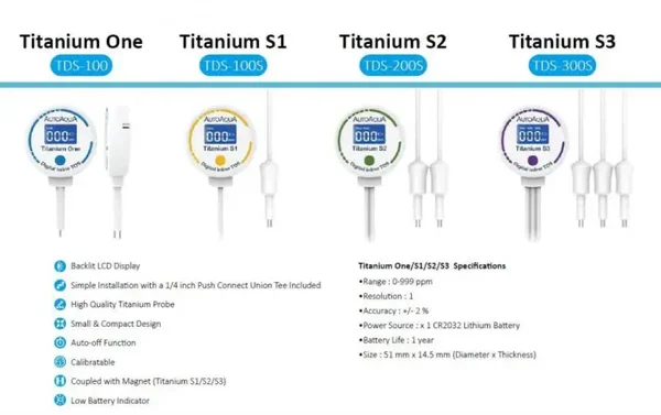 Titanium S1 ist auch ein sehr guter Indikator für den Wechsel von Filterpatronen oder der Umkehrosmosemembran. Titanium S1 ist mit 1 Titanprobe ausgestattet, die eine ausgezeichnete Korrosionsbeständigkeit bieten.