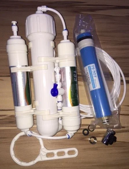Kostengünstige Komplett-Umkehr-Osmose-Anlage mit Schlauch und hochwerdigen Wasserhahnanschluss am vorhandenem Wasserhan montierbar.